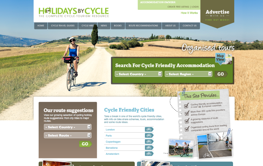 Holidays By Cycle is a brand new website for cycling enthusiasts and people who wish to have holidays around areas which are cycle friendly. With the ability for users to pin point cycling routes, plan a holiday, hire a bike and accomodation to suit.